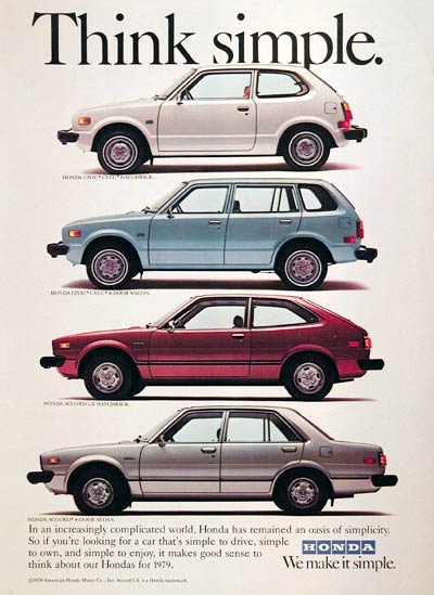 Think simple – думай просто. “В постоянно усложняющемся мире Хонда остаётся оазисом простоты. Поэтому если Вы ищете автомобиль, который просто водить, которым просто наслаждаться и просто владеть, то есть смысл подумать о наших Хондах 1979 модельного года.” We make it simple – мы за простоту.