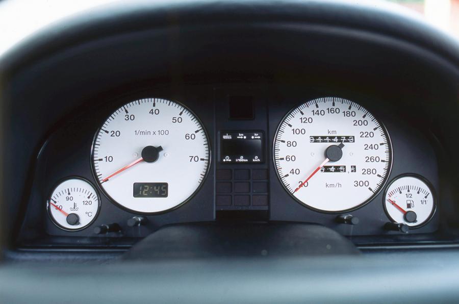 В салоне в общем-то скучно, он практически полностью повторяет интерьер S2, который по сути от простой Audi 80, но… Там есть спортивные ковши Recaro, там есть спортивный 3-спицевый руль (хотя на некоторых машинах встречается стандартный руль от базовой машины), у торпедо снизу 3 указателя (температура масла, давление наддува, вольтметр), спидометр размечен до 300 км/ч. Всё в общем-то стандартно. Дополнительно салон мог быть отделан деревом или – внимание – карбоном! Да-да, сейчас из него делают всё, что угодно, хочешь – корпус ключа, а хочешь – колёсный диск, но в 1994-м году… Это было очень круто!