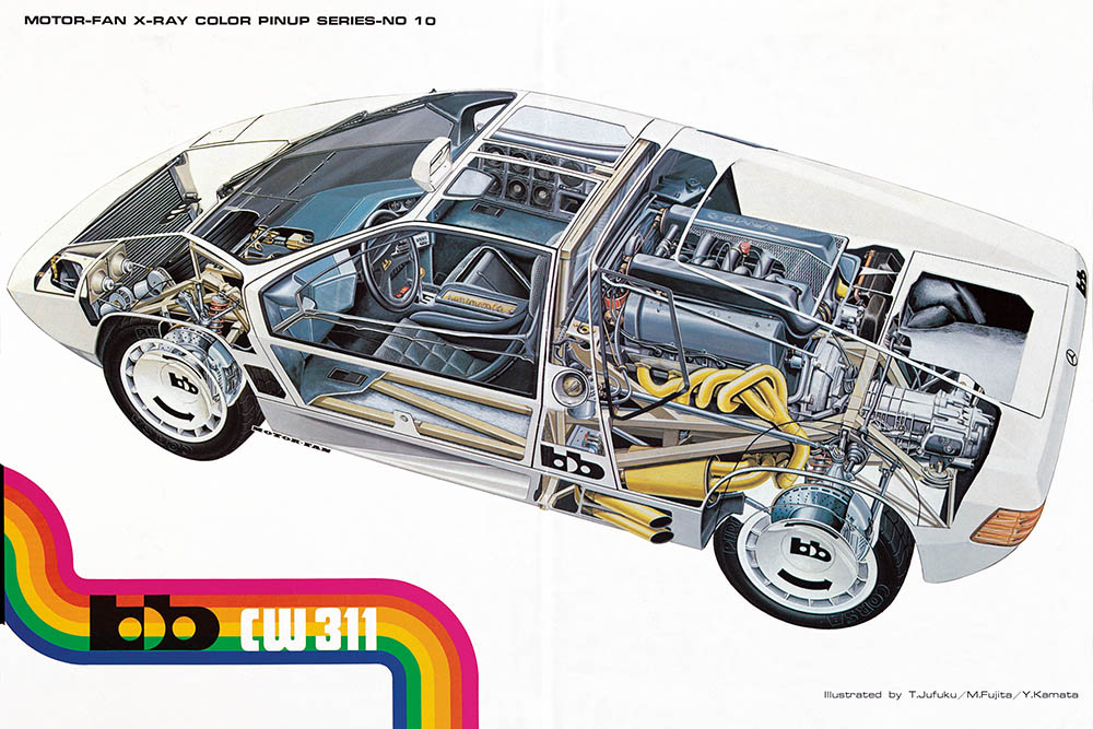 Изучая судьбу Императора и его предшественника – концепта B+B CW311, у меня родилось предположение, что “Шасси №1” (т.е. уже рассмотренная нами выше красная Isdera с вкладыша №8) – ни что иное, как доработанный прототип CW311. Isdera отличалась от него увеличенной базой, отсутствием щитков на фарах, другим двигателем и более скромными характеристиками. Компания B+B заявляла, что двигатель от главного монстроседана эпохи Mercedes W116 450SE-6.9, подготовленный AMG способен разогнать суперкар до скоростей, превышающих отметку 310 км/ч. Впрочем этого никто не проверял.