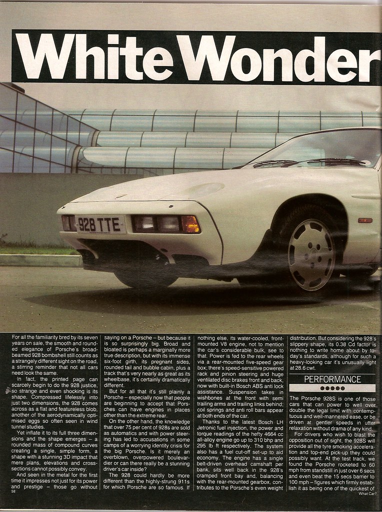 Так оно и оказалось, этот Порше 928S2 мелькал сразу в нескольких британских журналах за 1984 год. Пока нашлись только два скана из журналов Motor Sport и What Car?. Мне даже удалось найти полные сканы этих статей, но в них, увы, не было нужного ракурса этого Порше.