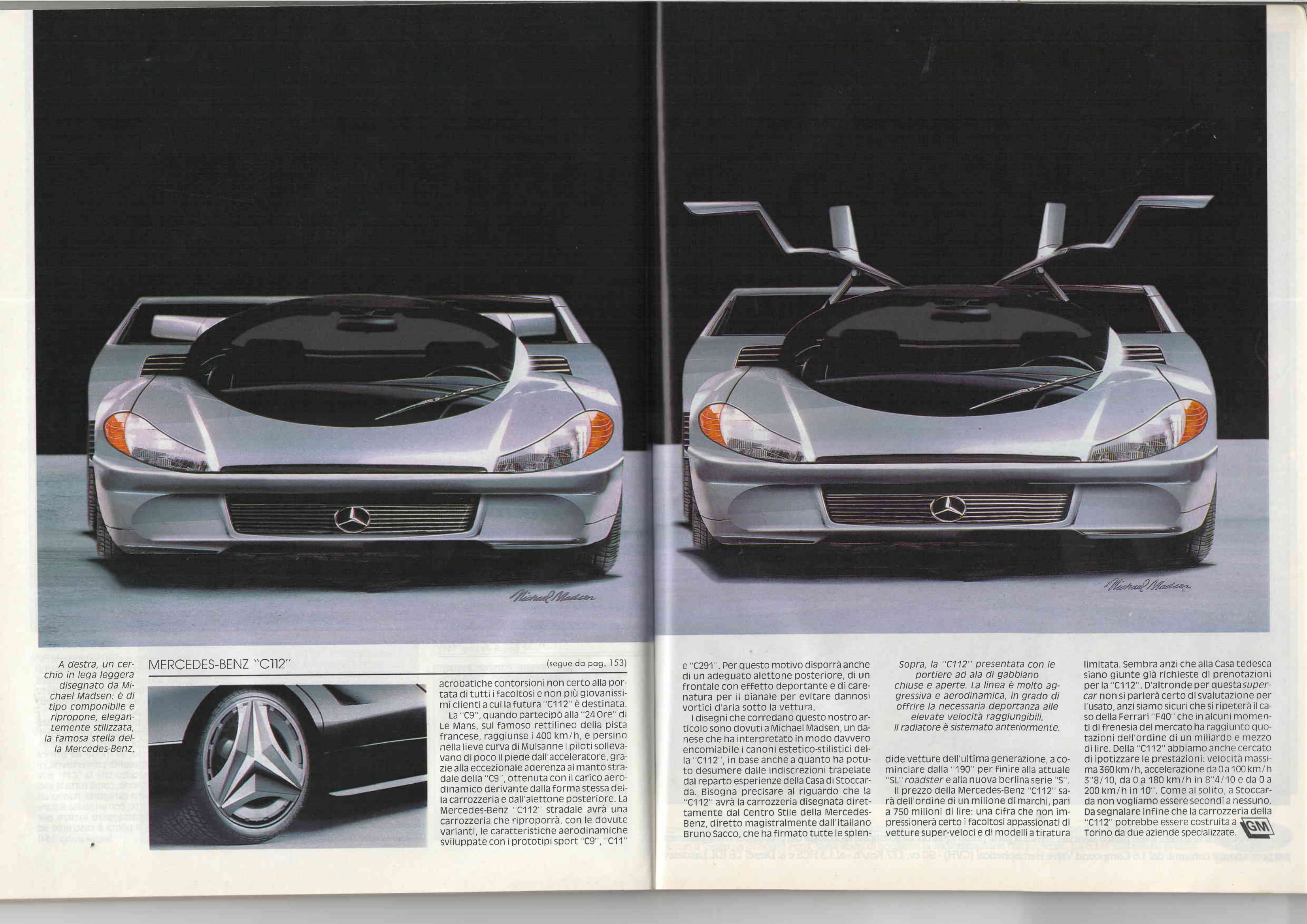 Этот тип дверей должен быть сохранен на будущей модели “C112”, которая хранится в секрете опытным отделом немецкого производителя. Фактически, мало что известно о его характеристиках, которые, прежде всего в отношении шасси, подвески и коробки передач, должны быть аналогичны характеристикам гоночного автомобиля “C11” 1990 года или, еще лучше, характеристикам нового спортивного прототипа “C291”, предназначенного для Чемпионата 91 года. Также, похоже, есть несколько вариантов для двигателей: турбонаддувный V8 “5.0” у “C11” (около 500-550 лошадиных сил), разработка более мощной версии нового “6.0” V12, построенного для новой серии седана S-класса (доведя мощность с 408 до вышеупомянутого уровня 500–550 лошадиных сил) или даже специальная турбоверсия 12-цилиндрового оппозитного «3.5» без наддува, который установлен на спортивном прототипе «C291».