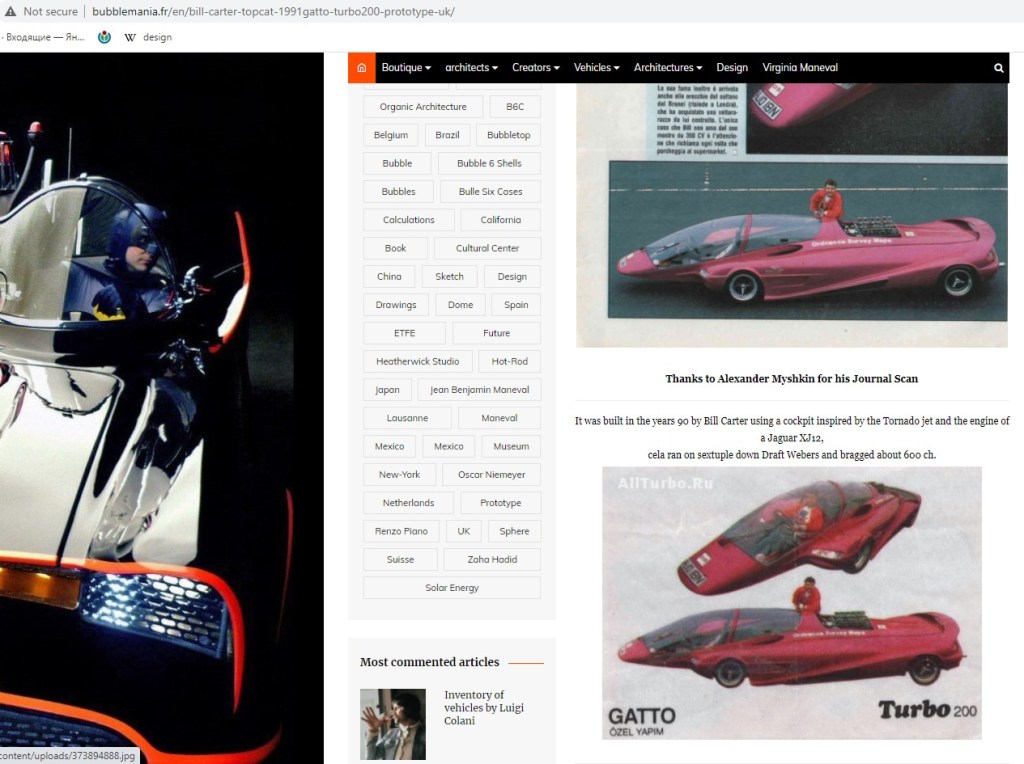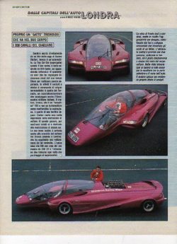 Перед нами уникальный концепт кар Билла Картера под названием “TopCat” (1991г.). Построенный с нуля автомобиль, приводится в движение мотором Jaguar V12. Необычная компоновка, в которой водитель и пассажир размещаются друг за другом обусловлена использованием фонаря кабины от реактивного истребителя Торнадо. У данного автомобиля необычное название, созвучное с героем из мульт-сериала “TopCat”. Также прилагается вырезка из журнала, от куда была взята исходная картинка изображенная на вкладыше Турбо №200