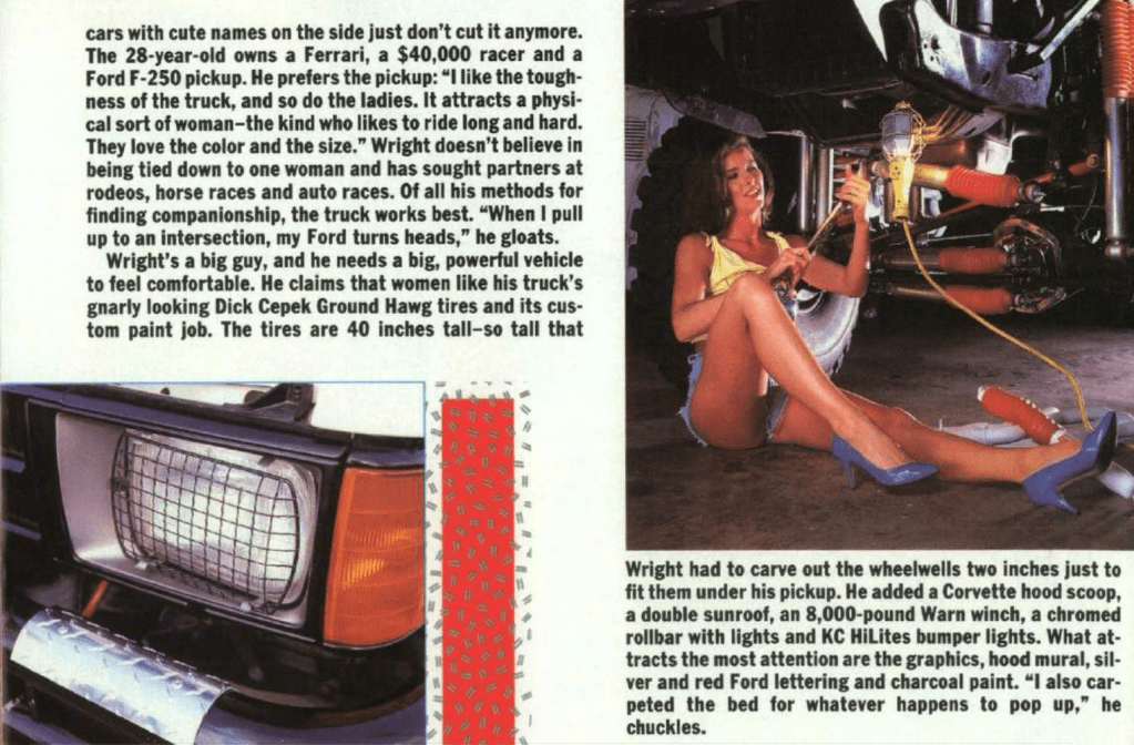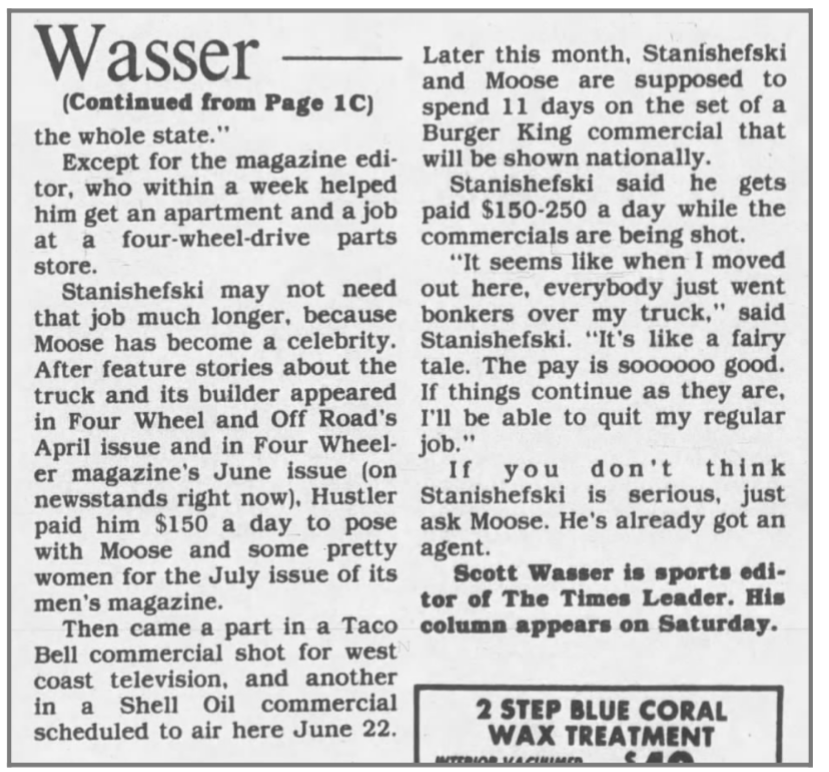 Засветившись в журнале Петерсона, оказавшись востребованным на телевидении, Роберт Станишефский стал сотрудничать с американским эротическим журналом Хастлер. Большая публикация в июльском номере за 1987 год “Лёгкие пикапы” фактически построена вокруг “Лося”. Если вкратце рассказать суть этой статьи, то говориться там о том, что женщины предпочитают большие и яркие машины дорогим спортивным автомобилям с яркими именами. Разбираться какой там двигатель у Феррари? Скучно! А с траками всё понятно – огромные колёса, ярко окрашенный кузов и уютный салон с приятными удобствами вроде хорошего стерео.