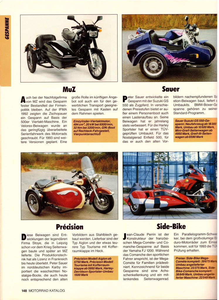 Жан-Клод Перрен — дизайнер французских колясок Mega Comete и Comanche на базе Yamaha FJ 1200. В то время как Comanche нравится спортивным водителям, Mega Comete предназначена для семей. Шарнирное рулевое управление и колесо коляски, которое рулит вместе с вами, характерны для обеих комбинаций. Параллелограммный вертлюг, который используется в мотоциклах эндуро большого объема, должен пройти тест TUV на 1993 год.